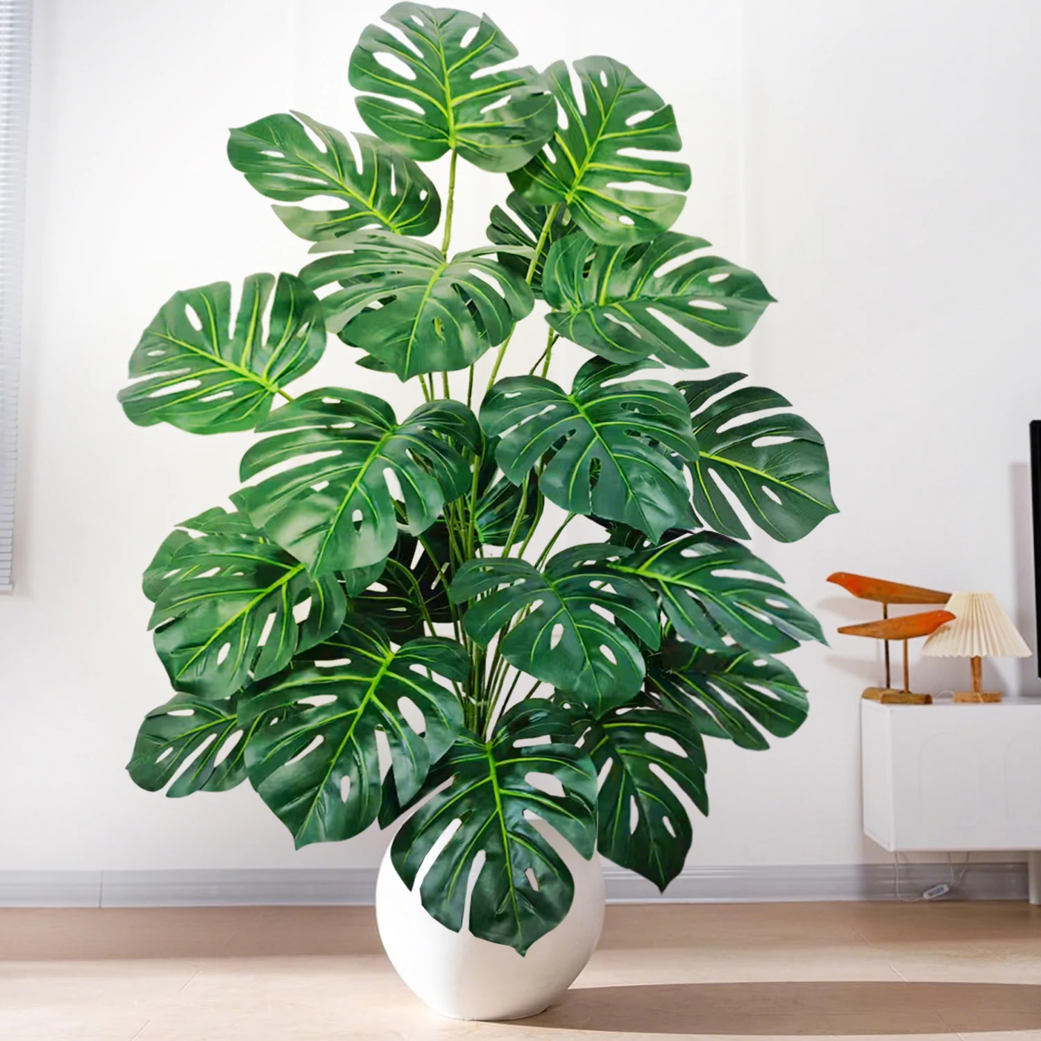 Each leaf is crafted to replicate the natural splits, deep green tones, and glossy texture that make monstera plants so distinctive. The result is a full, eye-catching piece that instantly upgrades your space and creates that clean, curated look seen in modern interiors.